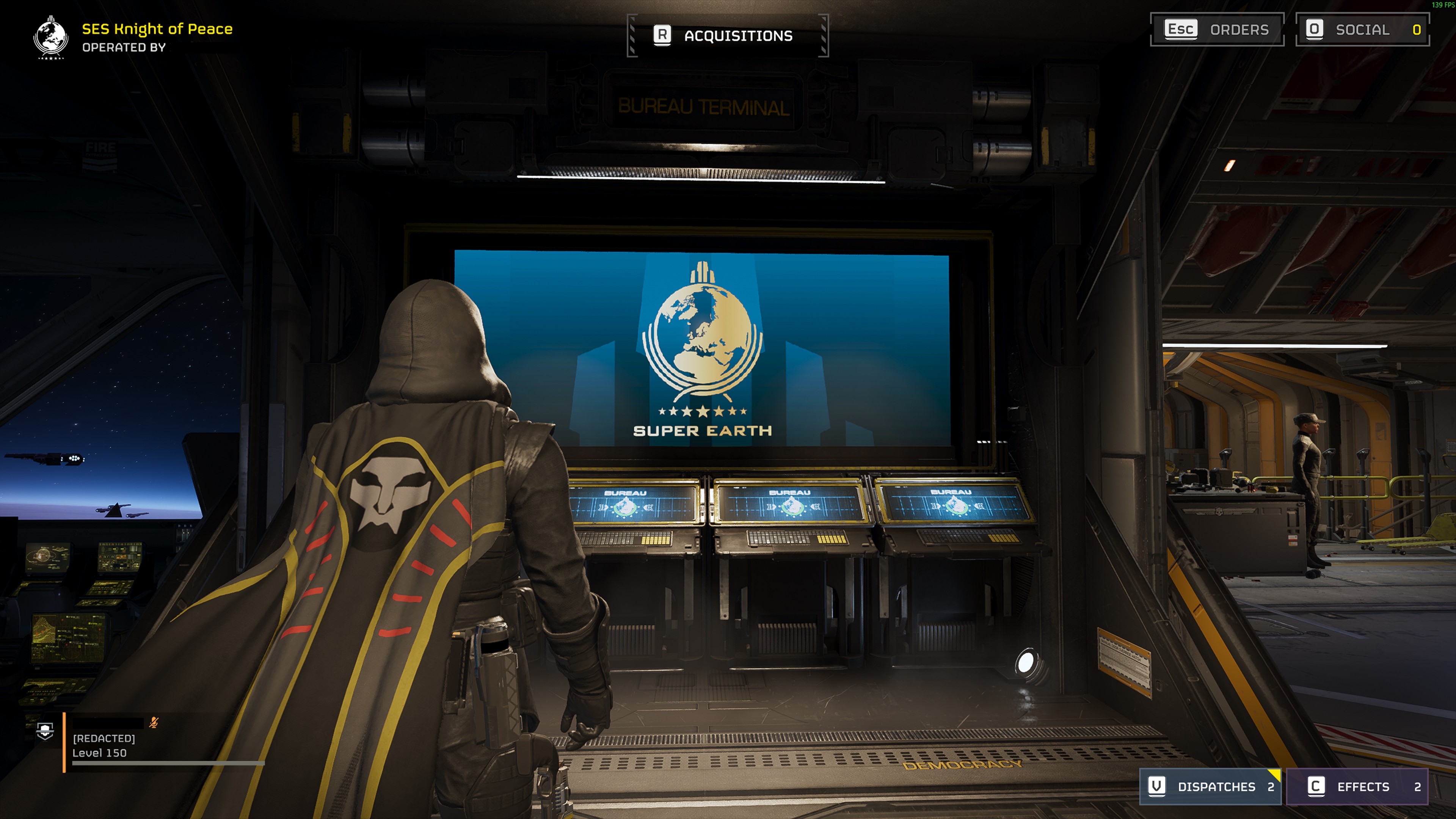 Helldivers 2 is a live-service, co-op PvE game built around ongoing war progression. Inside the player hub (Super Destroyer), there is a 'Bureau Terminal' that is currently unused (placeholder content).