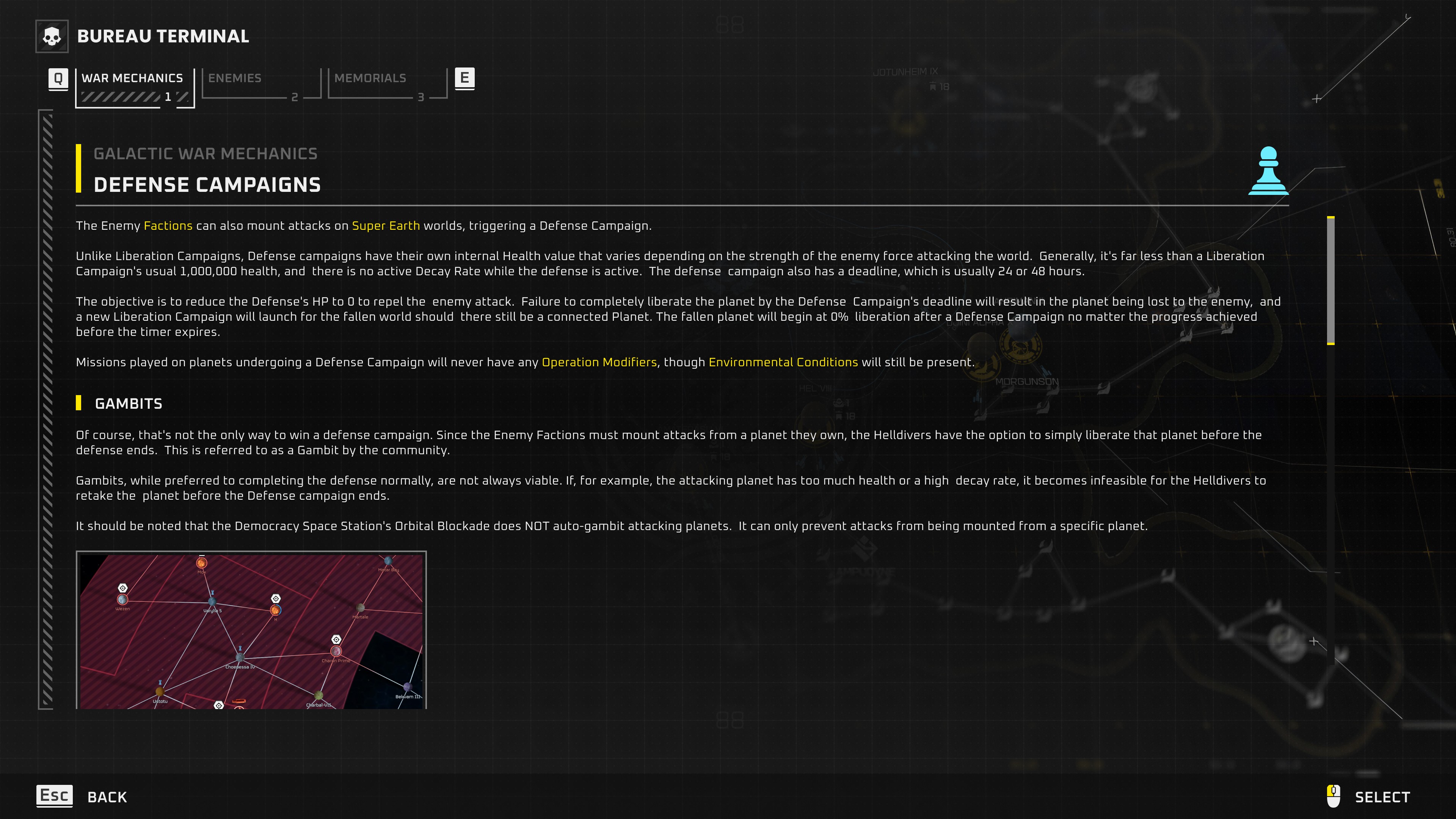The 'War Mechanics' menu would include all the broader information a player would need to know about the galactic war progression system that goes on through 'Liberation Campaigns and 'Defense Campaigns. For example; priority planets to focus on in certain major orders for more strategic value.