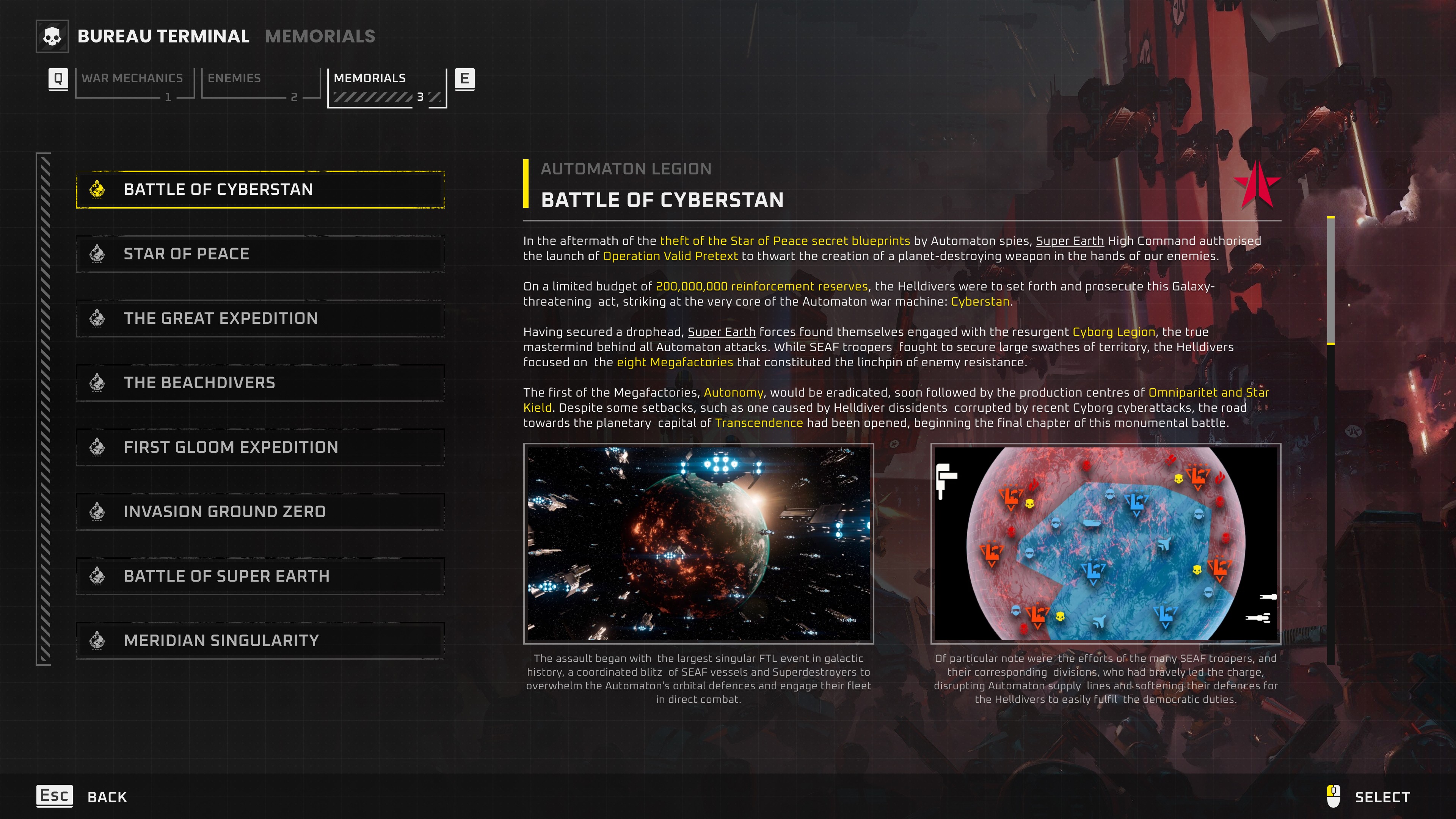 This is where all major events would be recorded for the Helldivers to view at anytime. I am sure veterans would enjoy reminiscing all the battles they took part in, recruits would be in awe of all the battles that their fellow players experienced and this would boost morale for them to participate in future major events accomplishing the sense of roleplay in the game.